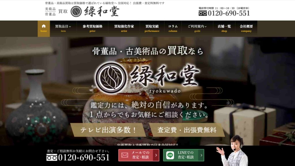 「緑和堂」は、骨董品・古美術品の買取を主軸とする専門店で、高価買取と確かな鑑定力に定評があります。日本国内のみならず世界中に広がる独自の販路を有しており、国内外のコレクターや市場とのネットワークを活かして、茶道具、掛軸、絵画、陶磁器、刀剣、漆器、屏風、中国美術、西洋骨董、書道具、象牙・珊瑚など、多岐にわたるジャンルの骨董・美術品を取り扱っています。
