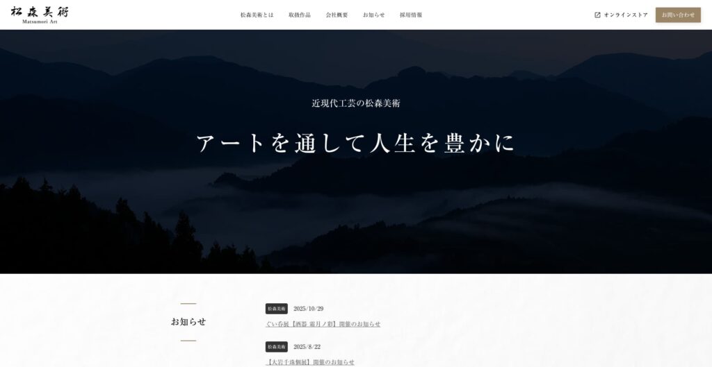 「松森美術」は、長い歴史の中で培われた確かな審美眼と鑑定技術を強みとし、国内外のコレクターや美術愛好家から高い信頼を得ています。古美術、茶道具、掛軸、陶磁器、漆芸、ガラスなど、日本の伝統と現代の感性が交錯する幅広いジャンルの作品に対応しています。