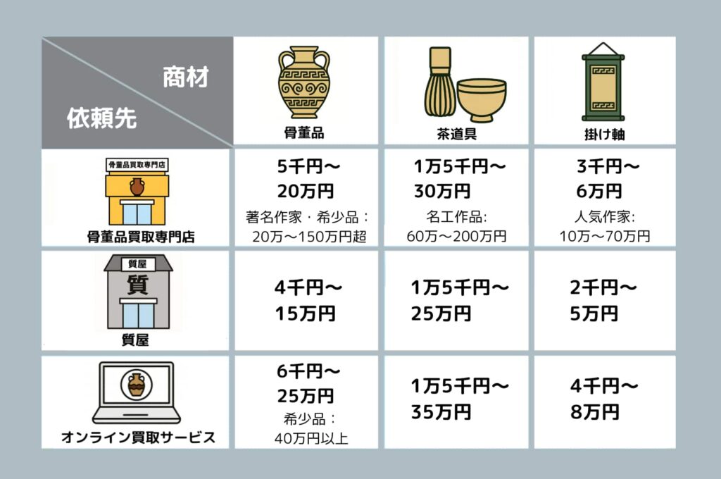 • 骨董品(陶磁器・彫刻・古美術など):5千円~20万円、著名作家・希少品は20万~150万円超