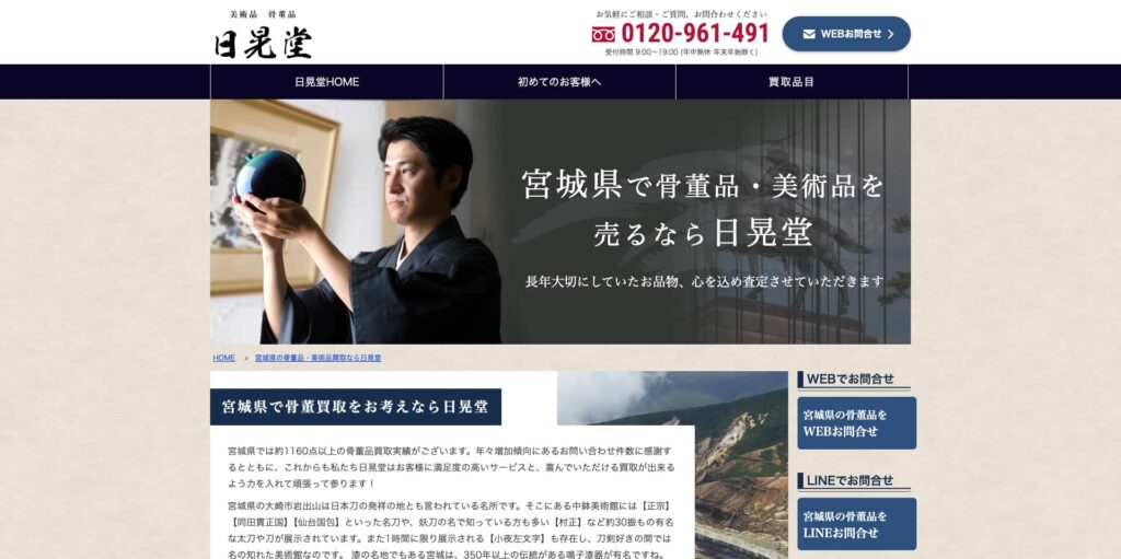 「日晃堂」は、宮城県仙台市を中心とする骨董品・古美術品の買取に特化した専門業者です。豊富な知識と経験を持つ査定士が在籍し、鑑定が難しい骨董品や美術品の価値を丁寧に見極め、買取価格を提示します。