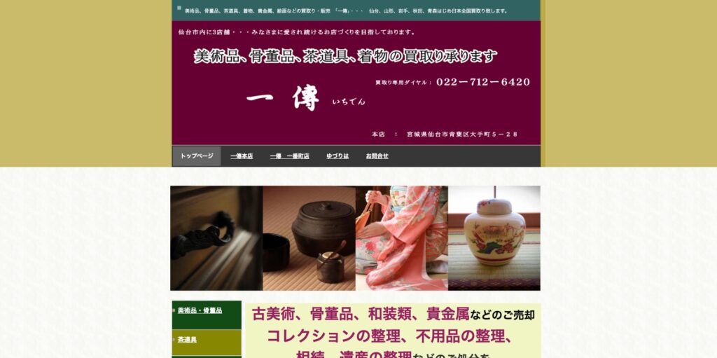仙台市を拠点に展開する「一傳」は、美術品や骨董品の買取・販売を中心に行う専門店です。地域に根ざした丁寧な対応と、長年培われた確かな目利き力により、多くの利用者から信頼を集めています。