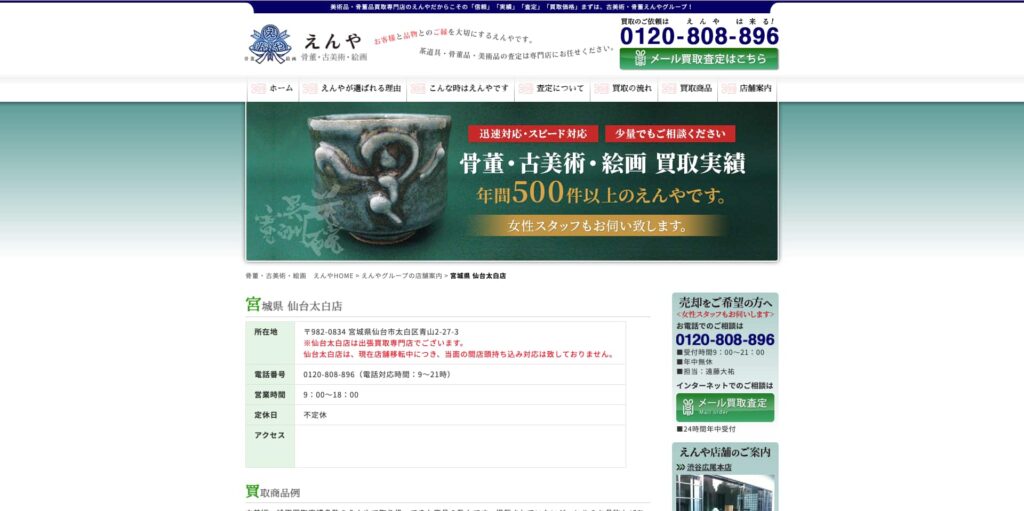 宮城県仙台市を拠点とする「えんや 仙台太白店」は、古美術・骨董品の買取を専門とする業者で、絵画や掛け軸、茶道具、中国美術など幅広いジャンルの品物に対応しています。