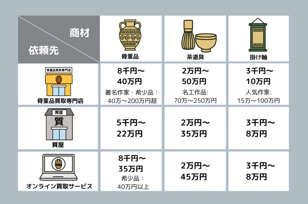 - 骨董品(陶磁器・彫刻・古美術など):8千円~40万円、著名作家・希少品は40万~200万円超