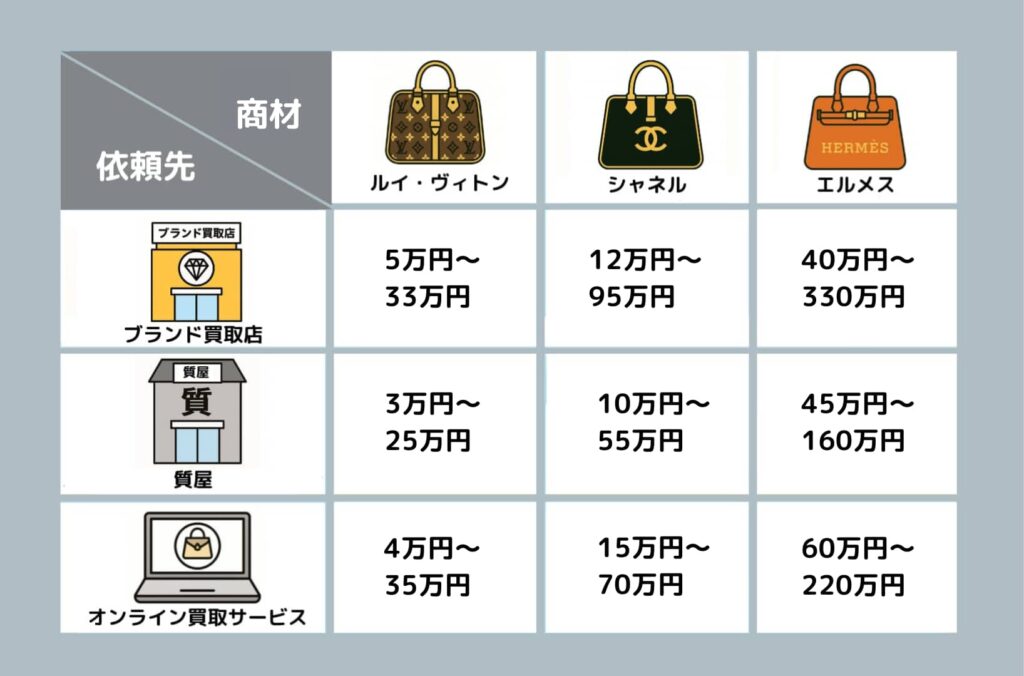 バッグの買取方法は、売却先やブランド、状態によって大きく異なります。ここでは、代表的な売却先である ブランド買取店・質屋・オンライン買取サービス を比較してみましょう。