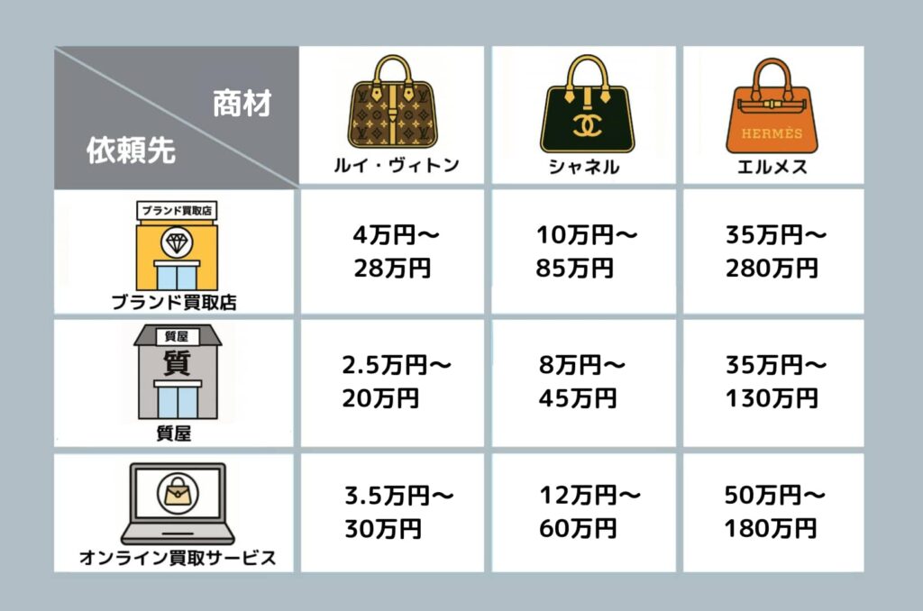 ブランド買取店は、最も高額査定が期待できる売却先です。専門の鑑定士が在籍しており、ブランド価値や市場動向を踏まえた適正価格を提示してくれます。例えばルイ・ヴィトンは4万~28万円程度、シャネルは10万~85万円程度、エルメスは 35万~280万円程度での買取が期待できます。