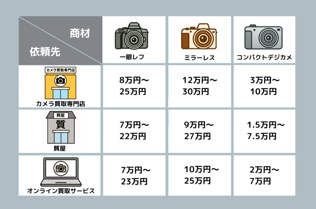 カメラの買取方法は、売却先やブランド、状態によって大きく異なります。ここでは、代表的な売却先である カメラ買取専門店・質屋・オンライン買取サービス を比較してみましょう。