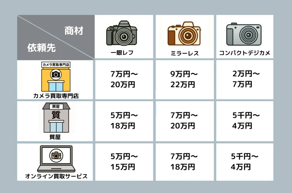 カメラの買取方法は、売却先やブランド、状態によって大きく異なります。ここでは、代表的な売却先である カメラ買取専門店・質屋・オンライン買取サービス を比較してみましょう。