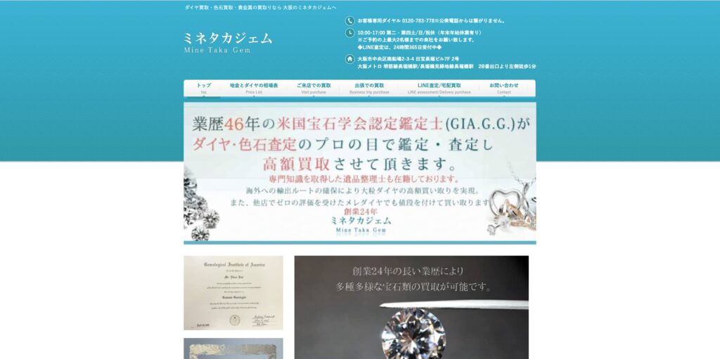 大阪市に拠点を構える「ミネタカジェム」は、ダイヤモンドを中心とした宝石・貴金属の買取を専門とする企業です。創業以来、海外マーケットに精通したバイヤーとして35年以上の実績を持ち、世界各国との取引ネットワークを活かした高価買取を強みとしています。