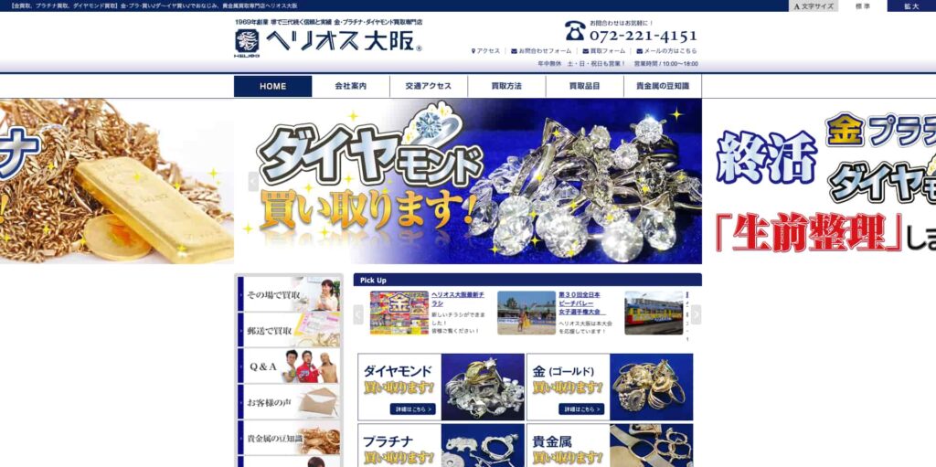 大阪市を拠点とする「ヘリオス大阪」は、老舗として長年にわたり実績を積み重ねてきた、宝飾・貴金属買取の専門企業です。金やプラチナ、特にダイヤモンド買取に注力しています。