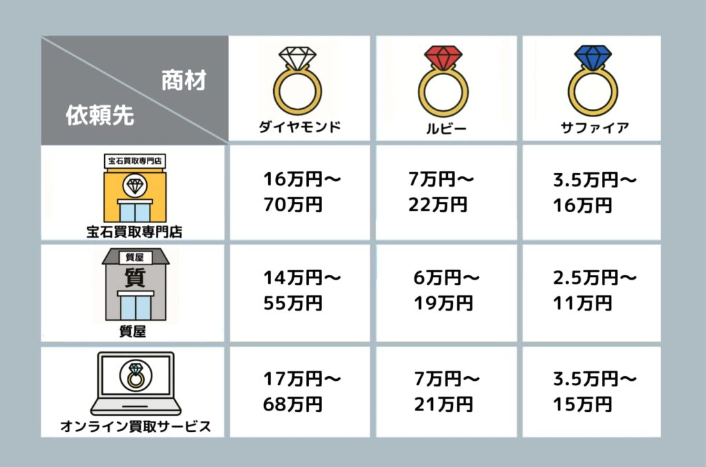 宝石の買取価格は、石の種類や品質(カラット・カラー・クラリティ・カット)、鑑定書の有無によって大きく異なります。ここでは代表的な売却先である 宝石買取店・質屋・オンライン買取サービス を比較してみましょう。