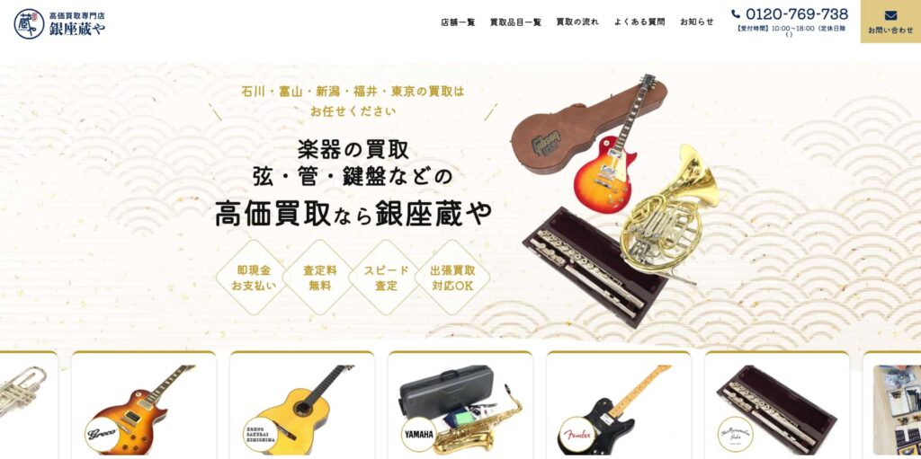 「銀座蔵や」は、ギターやサックスなどの弦楽器・管楽器をはじめ、鍵盤楽器や打楽器、和楽器まで幅広いジャンルの楽器を買取している買取専門店です。長年の買取実績をもとに楽器市場の動向を踏まえた査定を行っており、メーカーやモデル、コンディションまで細かく評価してくれる点が特徴です。