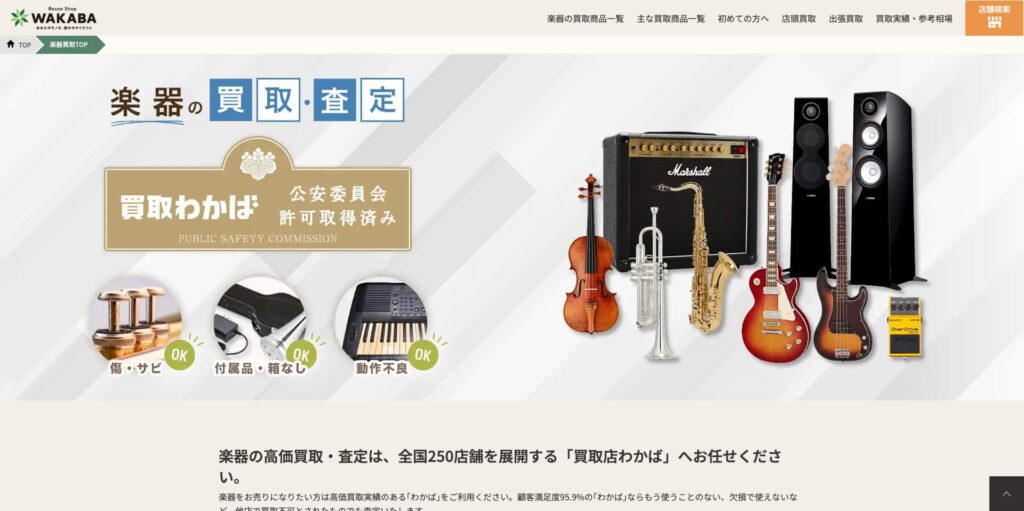 全国に多数の店舗を展開する「買取店わかば」は、ブランド品や貴金属などを扱う総合リユースショップで、楽器の買取にも力を入れています。ギターやベース、バイオリン、サックス、トランペット、アンプなど幅広い楽器を査定しており、使わなくなった楽器を気軽に売却できるのも魅力です。