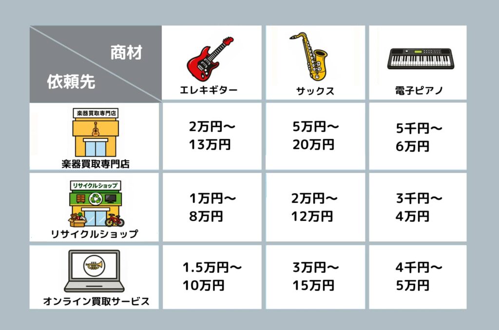 楽器の買取方法は、売却先や楽器の種類、状態によって大きく異なります。ここでは、代表的な売却先である楽器買取専門店・リサイクルショップ・オンライン買取サービスなどを比較してみましょう。