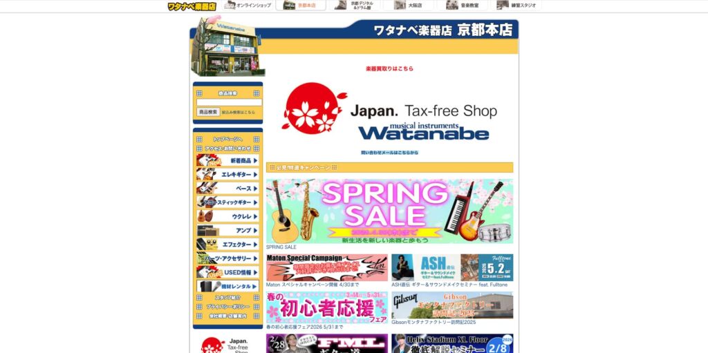 京都に本店を構える「ワタナベ楽器店 京都本店」は、創業70年以上の歴史を持つ老舗楽器店で、関西エリアを中心に高い知名度を誇ります。店頭販売に加え、通販やレンタル、音響機器の提供まで幅広く展開し、初心者からプロまで多くのユーザーに支持されています。