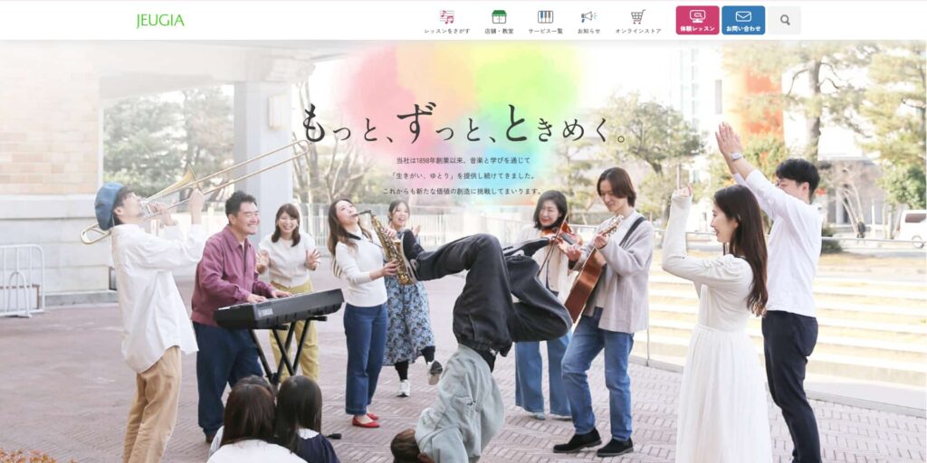 京都を拠点に120年以上の歴史を持つ「JEUGIA」は、楽器販売・音楽教室・カルチャー事業を展開する総合音楽企業です。創業以来、地域に根ざしたサービスを提供し、楽器を通じて人々の暮らしに生きがいやゆとりを届けてきました。
