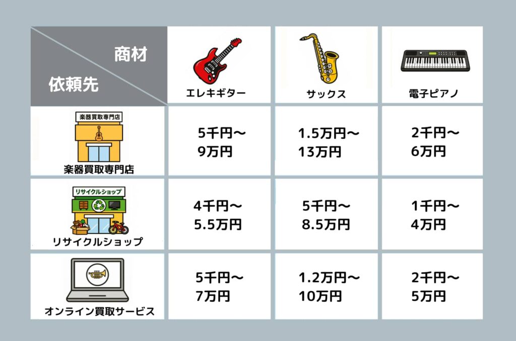 楽器の買取方法は、売却先や楽器の種類、状態によって大きく異なります。ここでは、代表的な売却先である楽器買取専門店・リサイクルショップ・オンライン買取サービスなどを比較してみましょう。