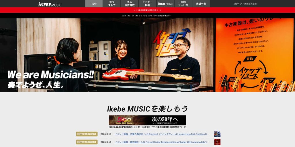 「イケベリユース」は、1975年創業の総合楽器店の専門知識を活かした楽器買取サービスです。ギターやベースをはじめ、アンプ、エフェクター、ドラム、シンセサイザー、管楽器など幅広い楽器・機材を対象としています。