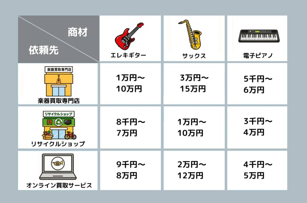楽器の買取方法は、売却先や楽器の種類、状態によって大きく異なります。ここでは、代表的な売却先である楽器買取専門店・リサイクルショップ・オンライン買取サービスなどを比較してみましょう。