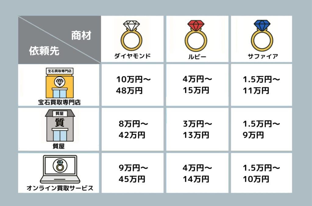 宝石の買取価格は、石の種類や品質(カラット・カラー・クラリティ・カット)、鑑定書の有無によって大きく異なります。ここでは代表的な売却先である宝石買取店・質屋・オンライン買取サービス を比較してみましょう。