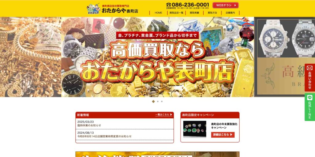 | おすすめポイント | 岡山県内最高額買取、経験豊富なプロ鑑定士在籍、即日現金化可能、買取保証制度あり(他店査定額より+1,000円上乗せ) |