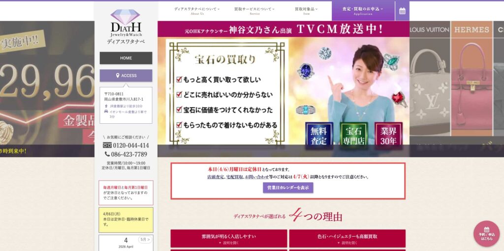 岡山市に店舗を構える「ディアスワタナベ」は、宝石業界で長年の実績を持つジュエリー専門店として、宝石・ジュエリーの高価買取に強みを持つ企業です。
