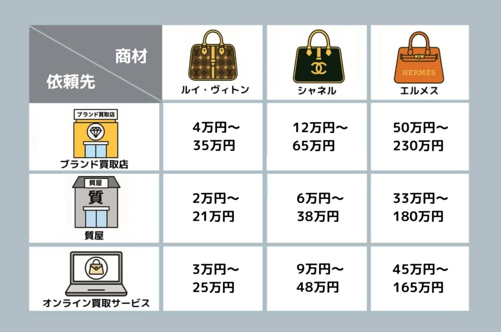 バッグの買取方法は、売却先やブランド、状態によって大きく異なります。ここでは、代表的な売却先である ブランド買取店・質屋・オンライン買取サービス を比較してみましょう。