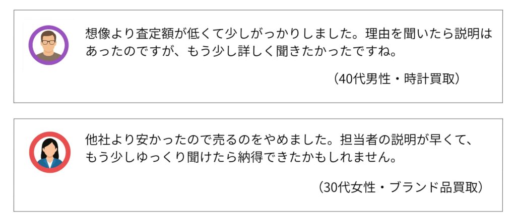 また、査定が早いぶん説明が少ないと感じる人もいるようです。ただ、「相場も知りたい」「理由を詳しく聞きたい」と伝えれば丁寧に説明してくれるので、気になる方は遠慮なく相談してみると良いですよ。
