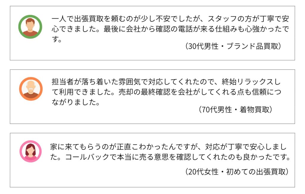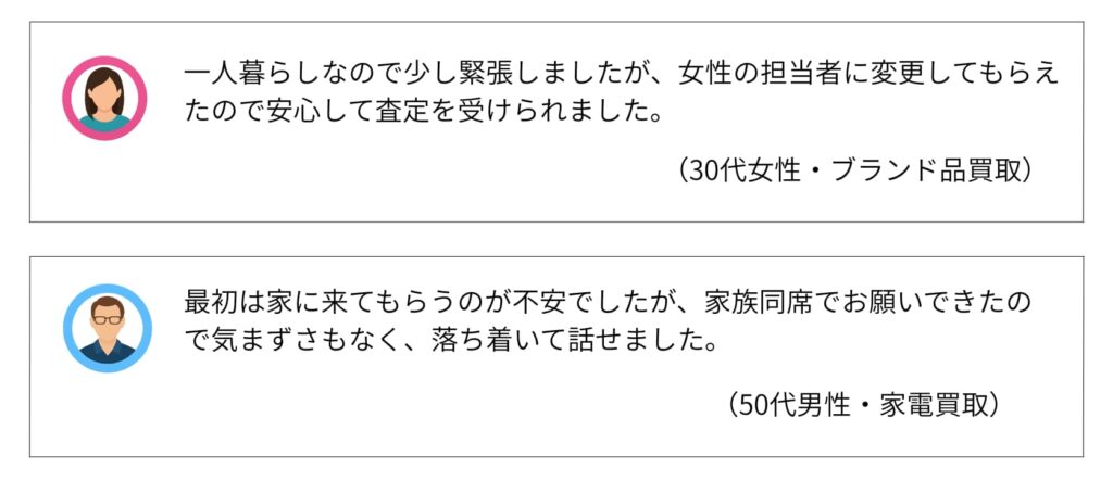 また、出張買取が初めてで「家に上がられるのが緊張した」と感じる人もいます。これはどの業者でも起こり得る不安なので、家族と立ち会ったり、女性スタッフを希望するなど、事前に伝えておくと安心です。