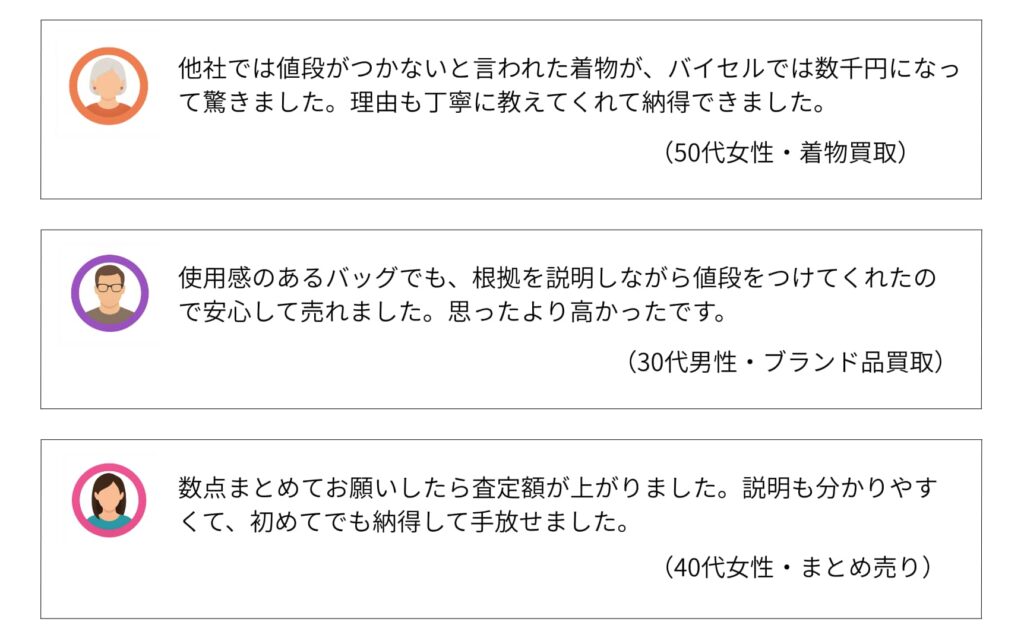 バイセルは接客の評価が高く、「安心して話せた」「丁寧で不安がなくなった」という声が多いですね。査定士さんが品物の背景や金額の理由まできちんと説明してくれるので、初めての人でも納得しながら進められるのが安心感につながっています。