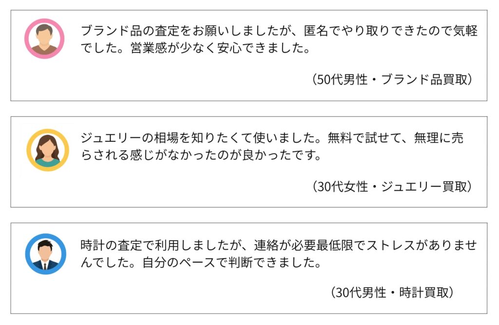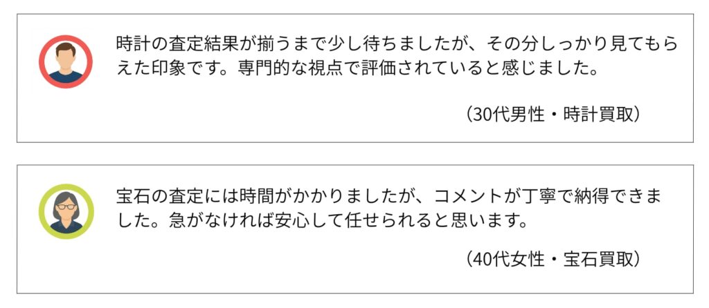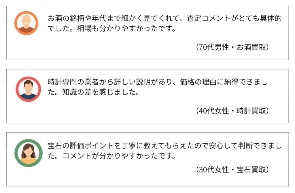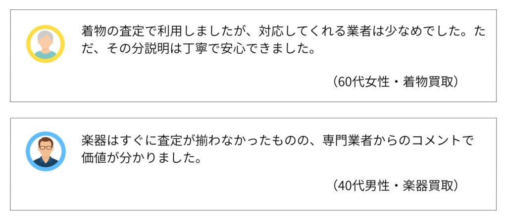 一方で、専門知識を持つ業者に絞って査定される分、「内容が丁寧だった」「説明が分かりやすかった」と評価する声もあります。相場確認として利用すれば、過度な期待との差は感じにくいでしょう。