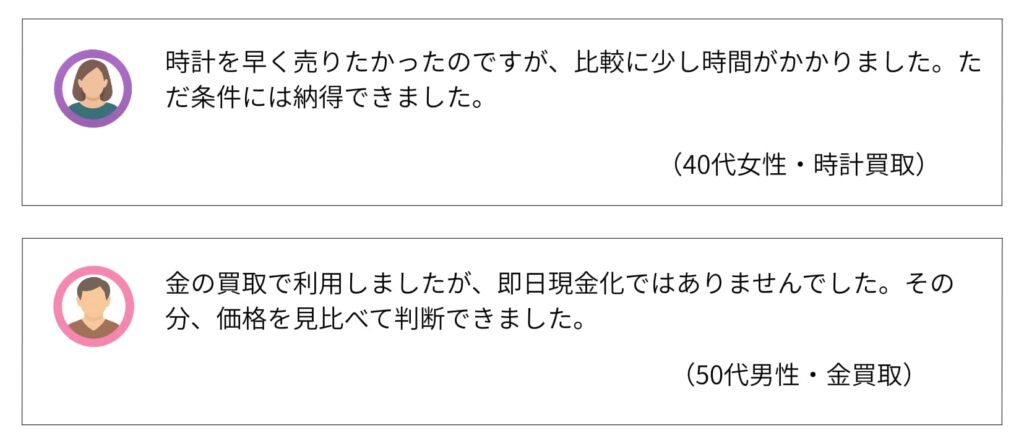 一方で、時間をかけて比較できる分、「条件に納得して売れた」「焦らず判断できた」といった評価もあります。急ぎでなければ、価格や対応を見比べたうえで売却できるため、結果的に満足度が高くなりやすいサービスと言えるでしょう。