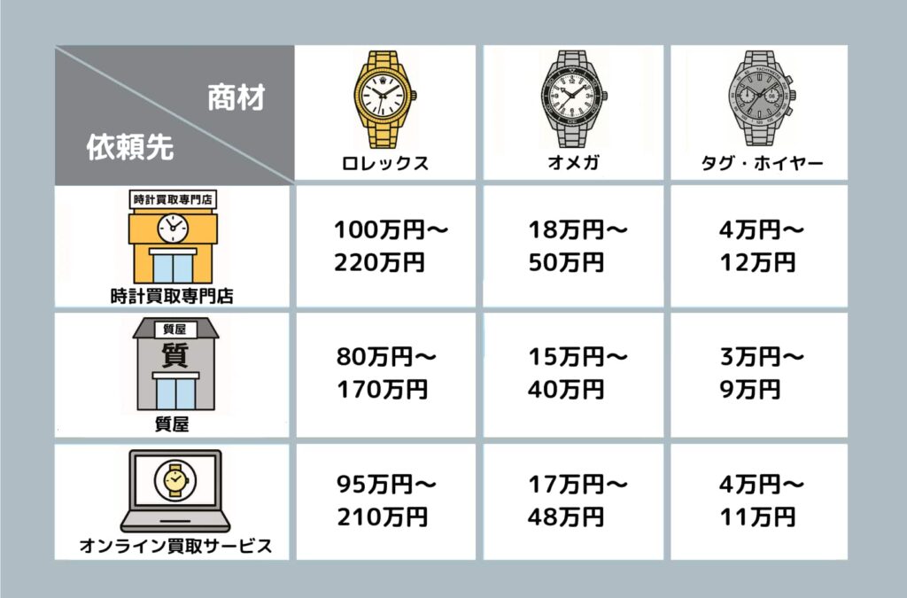 時計の買取方法は、売却先やブランド、状態によって大きく異なります。ここでは、代表的な売却先である 時計買取専門店・質屋・オンライン買取サービスを比較してみましょう。