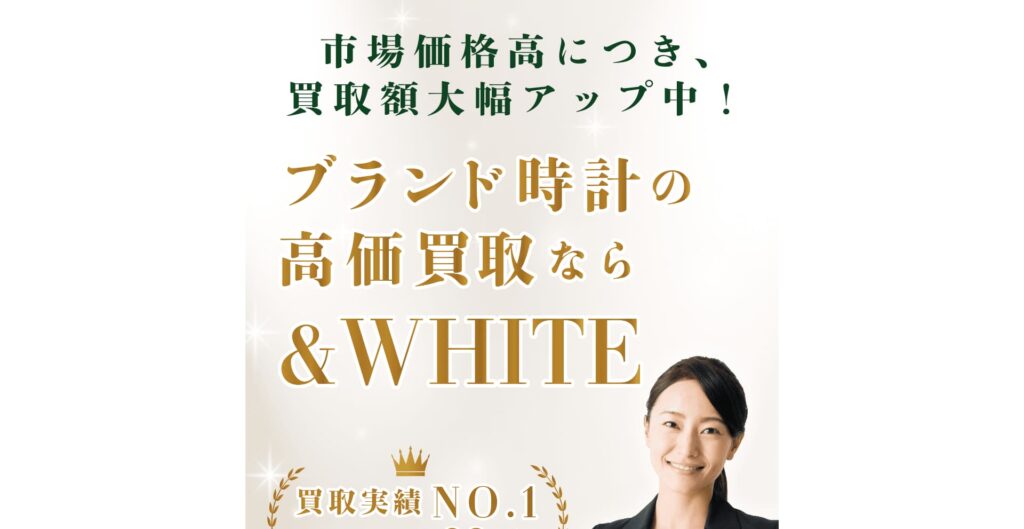 「&WHITE」は、ブランド時計の買取に特化した専門店です。全国に多数の店舗を展開し、地域問わず幅広く利用されています。「他社よりも1円でも高く買取」と掲げる通り、独自の海外販売ルートを活かし、国内では評価されにくいモデルでも高額査定が可能である点が特徴です。