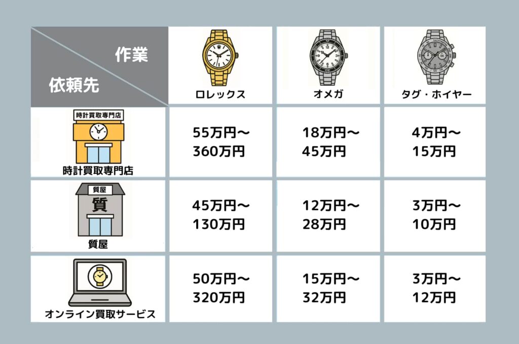 時計の買取方法は、売却先やブランド、状態によって大きく異なります。ここでは、代表的な売却先である 時計買取専門店・質屋・オンライン買取サービスを比較してみましょう。