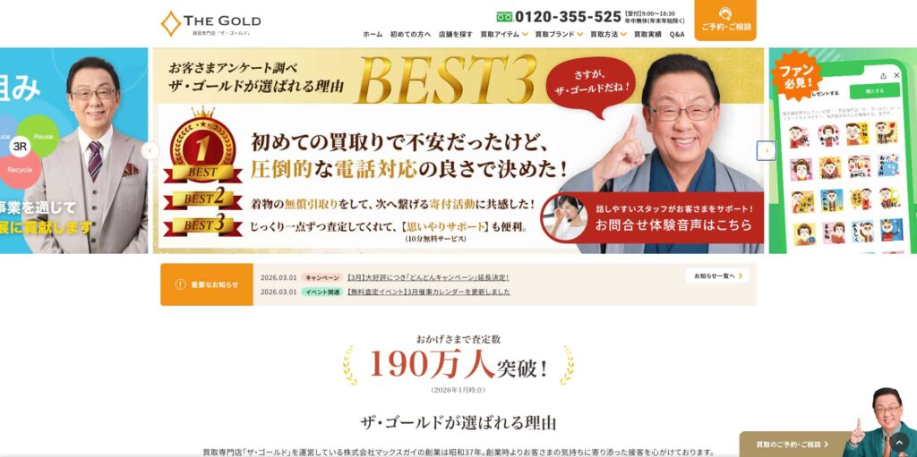全国展開する買取チェーン「ザ・ゴールド」の店舗の一つで、これまで80万人以上の買取実績を持つサービスとして知られています。店頭買取だけでなく、出張買取や宅配買取にも対応しており、ライフスタイルに合わせて利用できる点も魅力です。